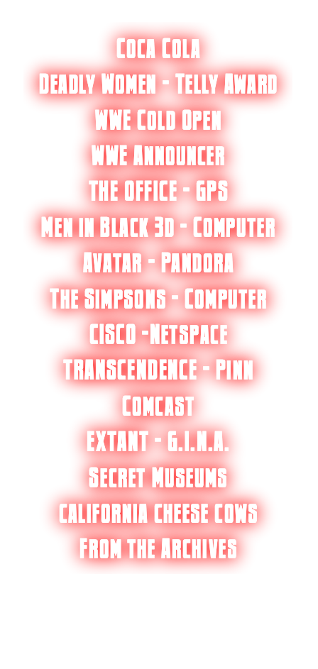 Female Voiceover Actress for Deadly Women - An Eye for an Eye Deadly Women - Outlaws WWE Cold Open WWE Announcer THE OFFICE - GPS Men in Black - 3d Computer Avatar - Pandora The Simpsons - Computer CISCO -Netspace Transcendence - Pinn Comcast Extant - G.I.N.A. Secret Museums California Cheese Cows Voice From the Archives commercial political sports promo promo narration interactive announcer movie magic Famous Voiceover actor Lynnanne Zager